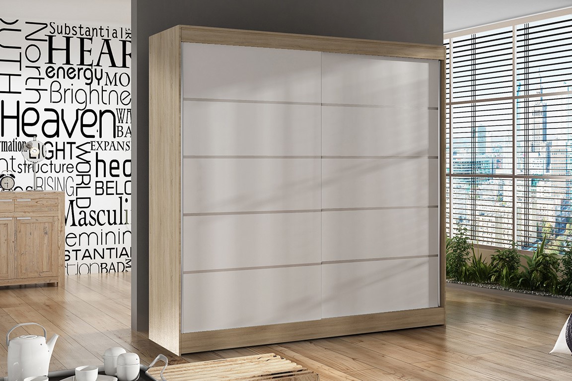 Šatníková skriňa BASTIAN 4 je vyrobená v modernom prevedení, ktoré sa hodí do každého priestoru. Skriňa je vyrobená z kvalitnej LTD dosky, ktorá nie je náročná na údržbu. Skriňa BASTIAN 4 je dvojdverová. Vo vnútri sa na ľavej a pravej strane nachádzajú praktické police, kde si môžete uložiť rôzne veci a v strede sa nachádza šatníková tyč nad ktorou je ešte jedna polica.Rozmery (ŠxVxH) : 200 x 215 x 58 cmFarebné prevedenie : dub sonoma/ bielaDodávame v demonte.