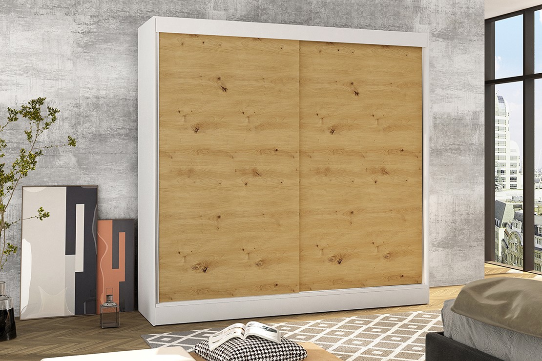 Šatníková skriňa BASTIAN X je vyrobená v modernom prevedení, ktoré sa hodí do každého priestoru. Skriňa je vyrobená z kvalitnej LTD dosky, ktorá nie je náročná na údržbu. Skriňa BASTIAN X je dvojdverová. Vo vnútri sa na ľavej a pravej strane nachádzajú praktické police, kde si môžete uložiť rôzne veci a v strede sa nachádza šatníková tyč nad ktorou je ešte jedna polica.Rozmery (ŠxVxH) : 200 x 215 x 58 cmFarebné prevedenie : biela/ dub artisanDodávame v demonte.