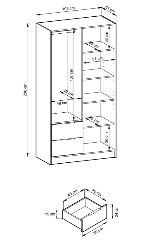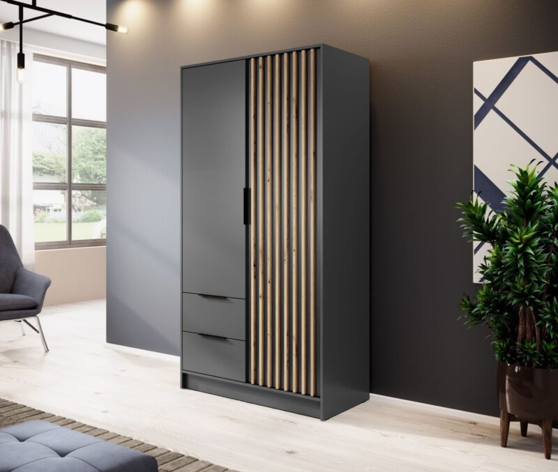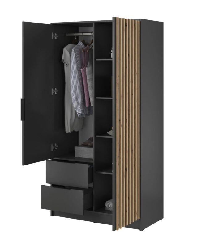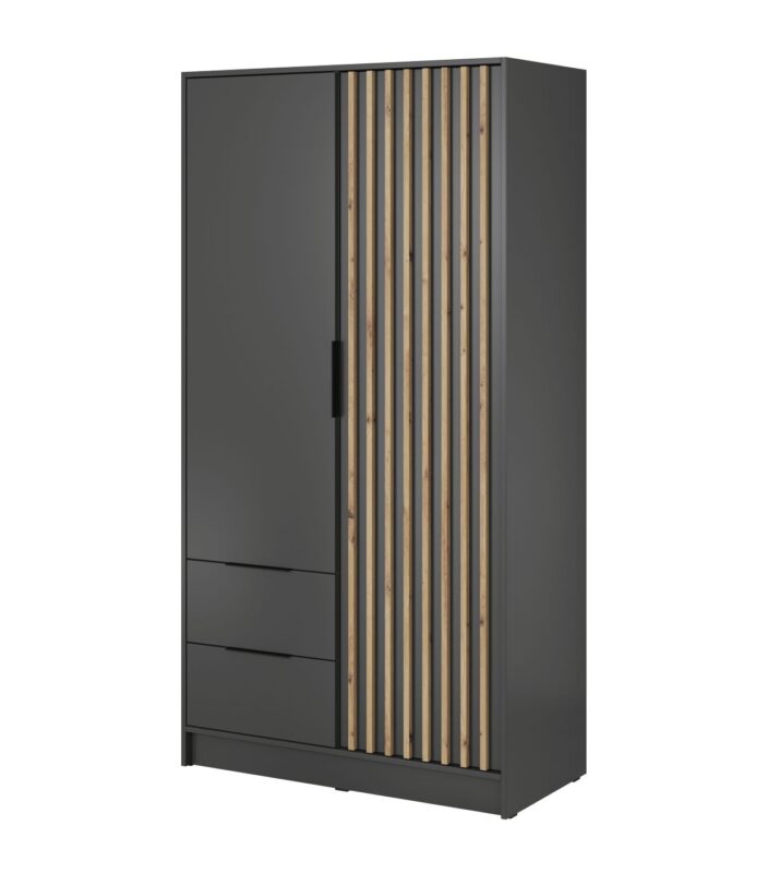 Šatníková skriňa NELA 2D má moderný dizajn, ktorý je momentálnym trendom. Skriňa sa skvelo hodí do spálne, detskej alebo študentskej izby ale svoje miesto si určite nájde aj v predsieni. Vo vnútri sa nachádza šatníková čast, kde si môžete zavesiť svoje oblečenie a policová časť. Skriňa NELA je vyrobená z kvalitnej LTD, ktorá má na dvierkach a korpuse hrúbku 16 mm. Hrany skrine sú chránené ABS páskou a na dvierkach skrine sú lemely, ktoré majú rozmer 18 x 18 mm a sú z MDF. Skriňa má kovové úchyty v čiernej farbe.Šatníková skriňa NELA 2D má na pravej strane policovu časť a na ľavej strane šatníkovú časť pod ktorou sa nachádzjú ešte 2 zásuvky.Materiál : 16mm LTD, ABS hrany, lamely z MDFRozmer (šxvxh): 105 x 200 x 51 cmFarebné prevedenie : grafitDodávame v demonte.