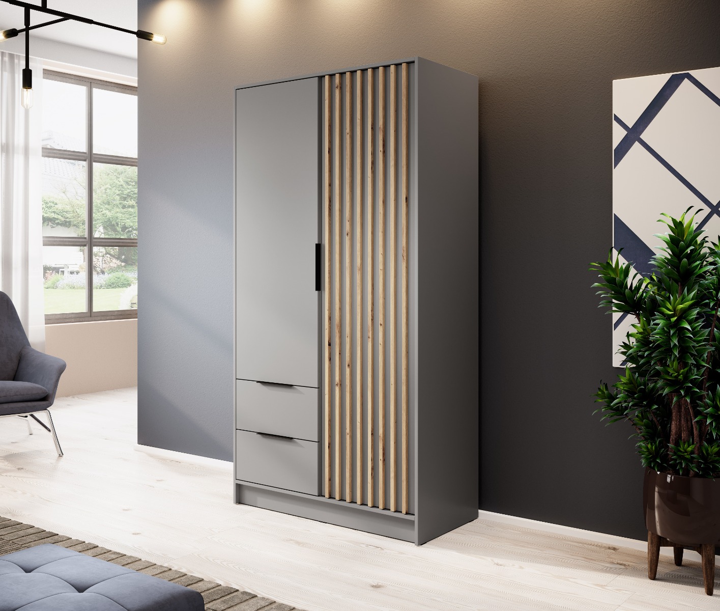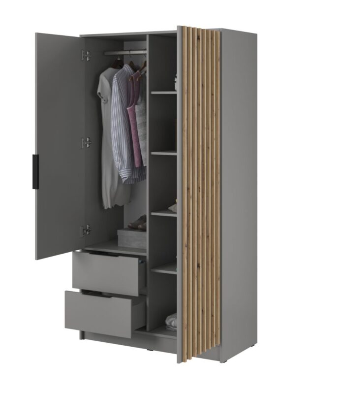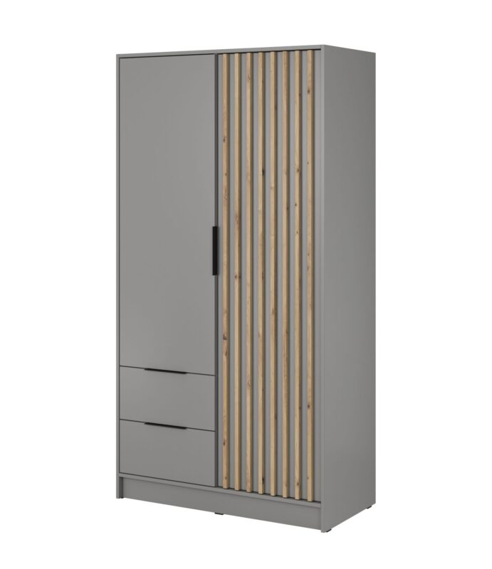 Šatníková skriňa NELA 2D má moderný dizajn, ktorý je momentálnym trendom. Skriňa sa skvelo hodí do spálne, detskej alebo študentskej izby ale svoje miesto si určite nájde aj v predsieni. Vo vnútri sa nachádza šatníková čast, kde si môžete zavesiť svoje oblečenie a policová časť. Skriňa NELA je vyrobená z kvalitnej LTD, ktorá má na dvierkach a korpuse hrúbku 16 mm. Hrany skrine sú chránené ABS páskou a na dvierkach skrine sú lemely, ktoré majú rozmer 18 x 18 mm a sú z MDF. Skriňa má kovové úchyty v čiernej farbe.Šatníková skriňa NELA 2D má na pravej strane policovu časť a na ľavej strane šatníkovú časť pod ktorou sa nachádzjú ešte 2 zásuvky.Materiál : 16mm LTD, ABS hrany, lamely z MDFRozmer (šxvxh): 105 x 200 x 51 cmFarebné prevedenie : šedáDodávame v demonte.