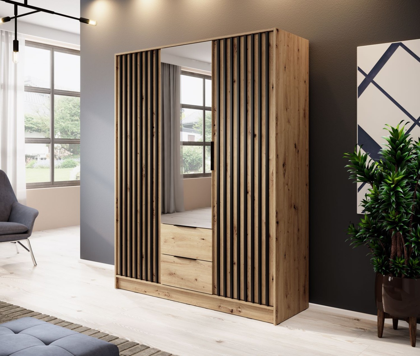 Šatníková skriňa NELA 3D so zrkadlom má moderný dizajn, ktorý je momentálnym trendom. Skriňa sa skvelo hodí do spálne, detskej alebo študentskej izby ale svoje miesto si určite nájde aj v predsieni.Vo vnútri sa nachádza šatníková čast, kde si môžete zavesiť svoje oblečenie a policová časť. Skriňa NELA je vyrobená z kvalitnej LTD, ktorá má na dvierkach a korpuse hrúbku 16 mm. Hrany skrine sú chránené ABS páskou a na dvierkach skrine sú lemely, ktoré majú rozmer 18 x 18 mm a sú z MDF. Skriňa má kovové úchyty v čiernej farbe.Šatníková skriňa NELA 3D má na pravej aj ľavej strane policovú časť a v strede sa nachádza šatníková časť pod ktorou sú dve zásuvky. Na stredných dvierkach sa nachádza zrkadlo. Materiál : 16mm LTD, ABS hrany, lamely z MDFRozmer (šxvxh): 155 x 200 x 51 cmFarebné prevedenie : dub artisanDodávame v demonte.