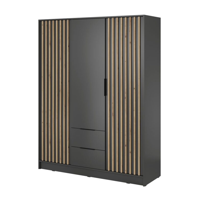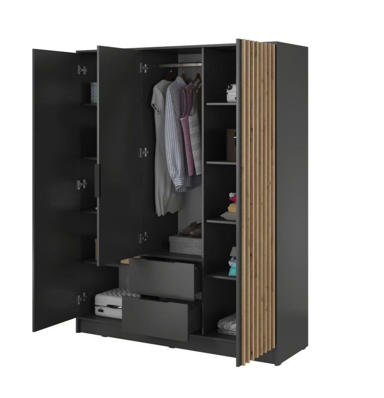 Šatníková skriňa NELA 3D má moderný dizajn, ktorý je momentálnym trendom. Skriňa sa skvelo hodí do spálne, detskej alebo študentskej izby ale svoje miesto si určite nájde aj v predsieni.Vo vnútri sa nachádza šatníková čast, kde si môžete zavesiť svoje oblečenie a policová časť. Skriňa NELA je vyrobená z kvalitnej LTD, ktorá má na dvierkach a korpuse hrúbku 16 mm. Hrany skrine sú chránené ABS páskou a na dvierkach skrine sú lemely, ktoré majú rozmer 18 x 18 mm a sú z MDF. Skriňa má kovové úchyty v čiernej farbe.Šatníková skriňa NELA 3D má na pravej aj ľavej strane policovú časť a v strede sa nachádza šatníková časť pod ktorou sú dve zásuvky.Materiál : 16mm LTD, ABS hrany, lamely z MDFRozmer (šxvxh): 155 x 200 x 51 cmFarebné prevedenie : grafitDodávame v demonte.