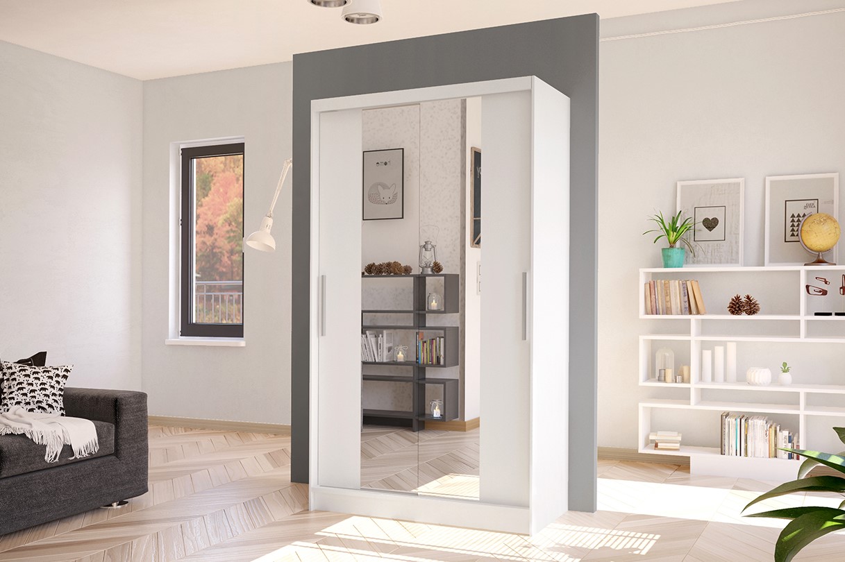 Skriňa RICA 2 v zaujímavom dizajnovom prevedení spĺňa všetky požiadavky na šatníkovú skriňu. Skriňa má vešiakovú časť, kde si zavesíte všetko čo potrebujete a policovú časť, ktorá Vám poskytne veľký úložný priestor. Na dvierkach sa nachádza zrkadlo. Skriňa je vyrobená z kvalitnej LTD dosky.Rozmery (ŠxVxH) : 96,8 x 200 x 58,1 cmFarebné prevedenie : bielaDodávame v demonte.