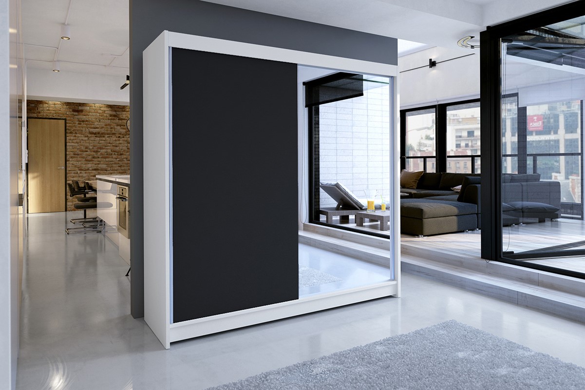 Šatníková skriňa TALLYA 1 je vyrobená v dizajnovom prevedení. Zrkadlová plocha na dverách skrine jej dodáva štýl. Vďaka svojej elegancii je skriňa vhodná do akéhokoľvek priestoru. Je vyrobená z kvalitnej LTD dosky, ktorá nie je náročná na údržbu.Skriňa TALLYA 1 ponúka komfortný úložný priestor. Vo vnútri sa nachádza šatníková tyč a praktické police na odloženie šatstva alebo iných vecí.Rozmer (ŠxVxH) : 180 x 215 x 58Farebné prevedenie : biela/ čiernaDodávame v demonte.