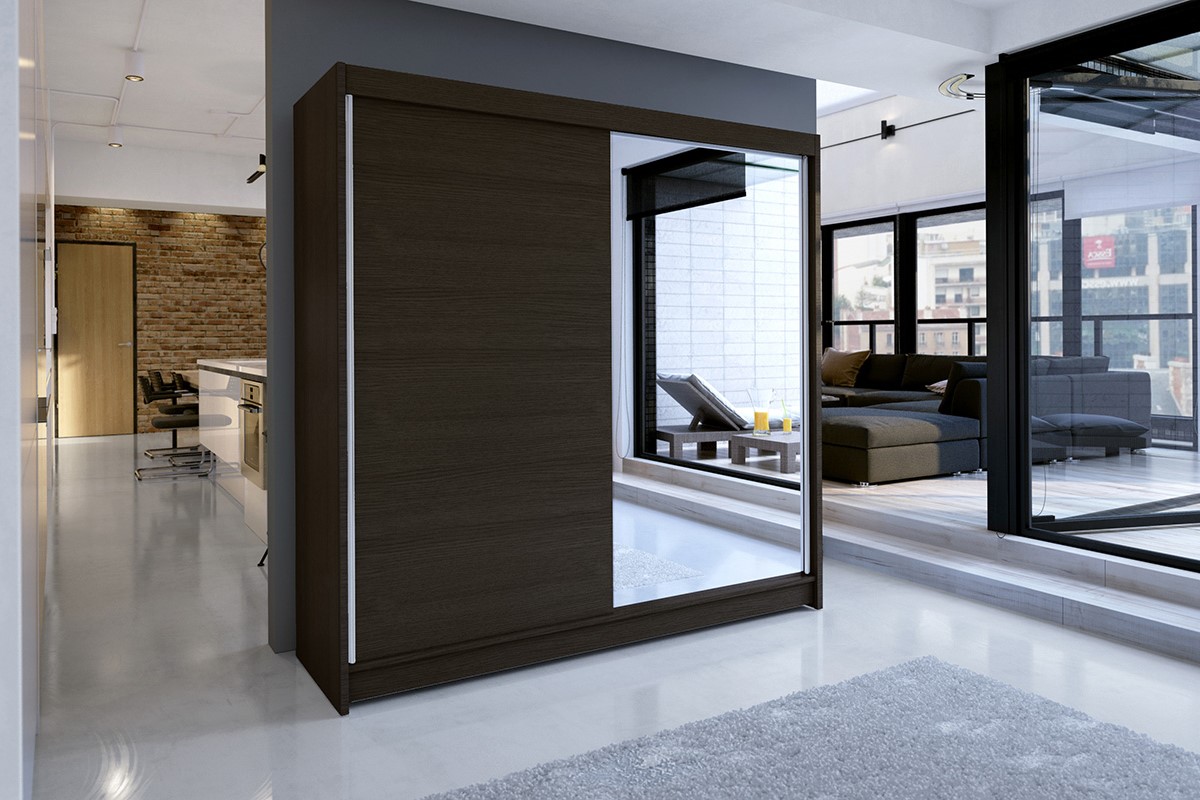 Šatníková skriňa TALLYA 1 je vyrobená v dizajnovom prevedení. Zrkadlová plocha na dverách skrine jej dodáva štýl. Vďaka svojej elegancii je skriňa vhodná do akéhokoľvek priestoru. Je vyrobená z kvalitnej LTD dosky, ktorá nie je náročná na údržbu.Skriňa TALLYA 1 ponúka komfortný úložný priestor. Vo vnútri sa nachádza šatníková tyč a praktické police na odloženie šatstva alebo iných vecí.Rozmer (ŠxVxH) : 180 x 215 x 58Farebné prevedenie : čokoládaDodávame v demonte.
