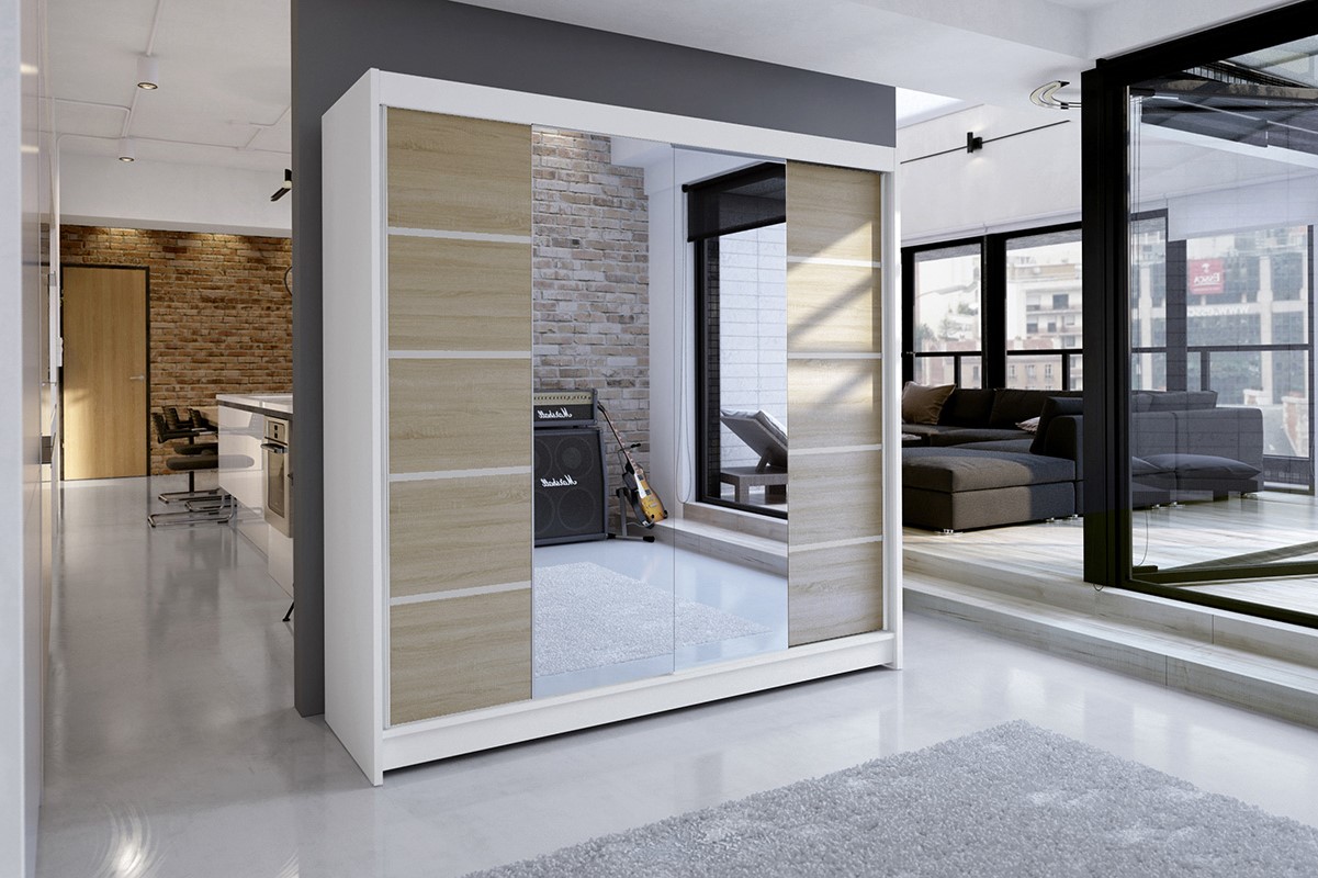 Šatníková skriňa TALLYA 5 je vyrobená v dizajnovom prevedení. Zrkadlová plocha na dverách skrine jej dodáva štýl. Vďaka svojej elegancii je skriňa vhodná do akéhokoľvek priestoru. Je vyrobená z kvalitnej LTD dosky, ktorá nie je náročná na údržbu.Skriňa TALLYA 5 ponúka komfortný úložný priestor. Vo vnútri sa nachádza šatníková tyč a praktické police na odloženie šatstva alebo iných vecí.Rozmer (ŠxVxH) : 180 x 215 x 58Farebné prevedenie : biela/ dub sonomaDodávame v demonte.
