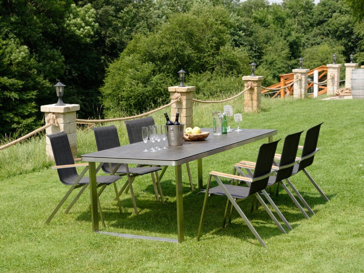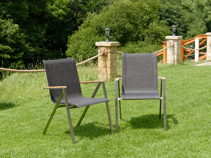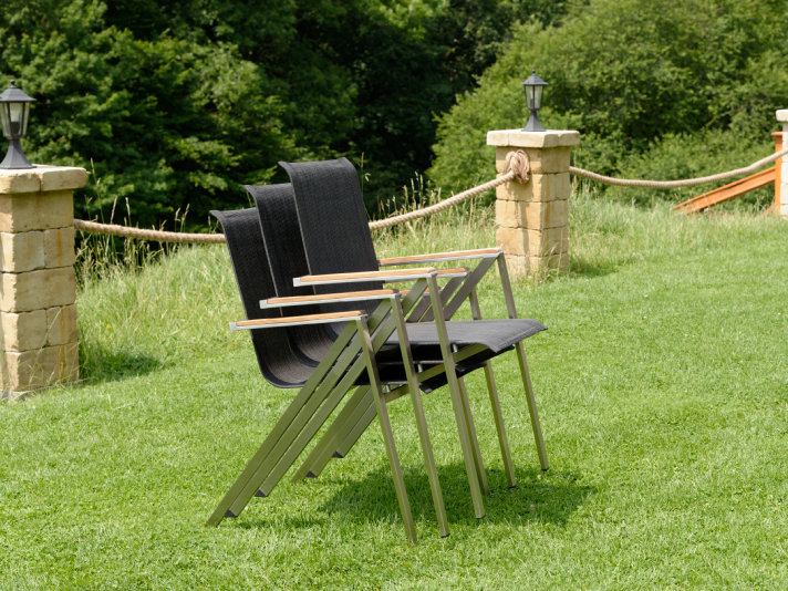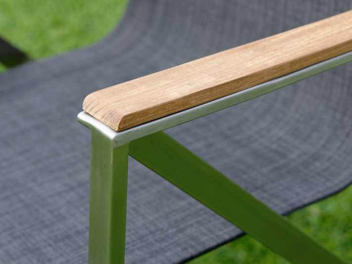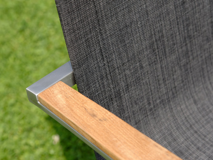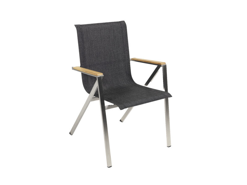 Moderná a zároveň praktická stohovateľná záhradná stolička Seattle z kvalitnej nerezovej ocele s pohodlnými podrúčkami z teakového dreva.