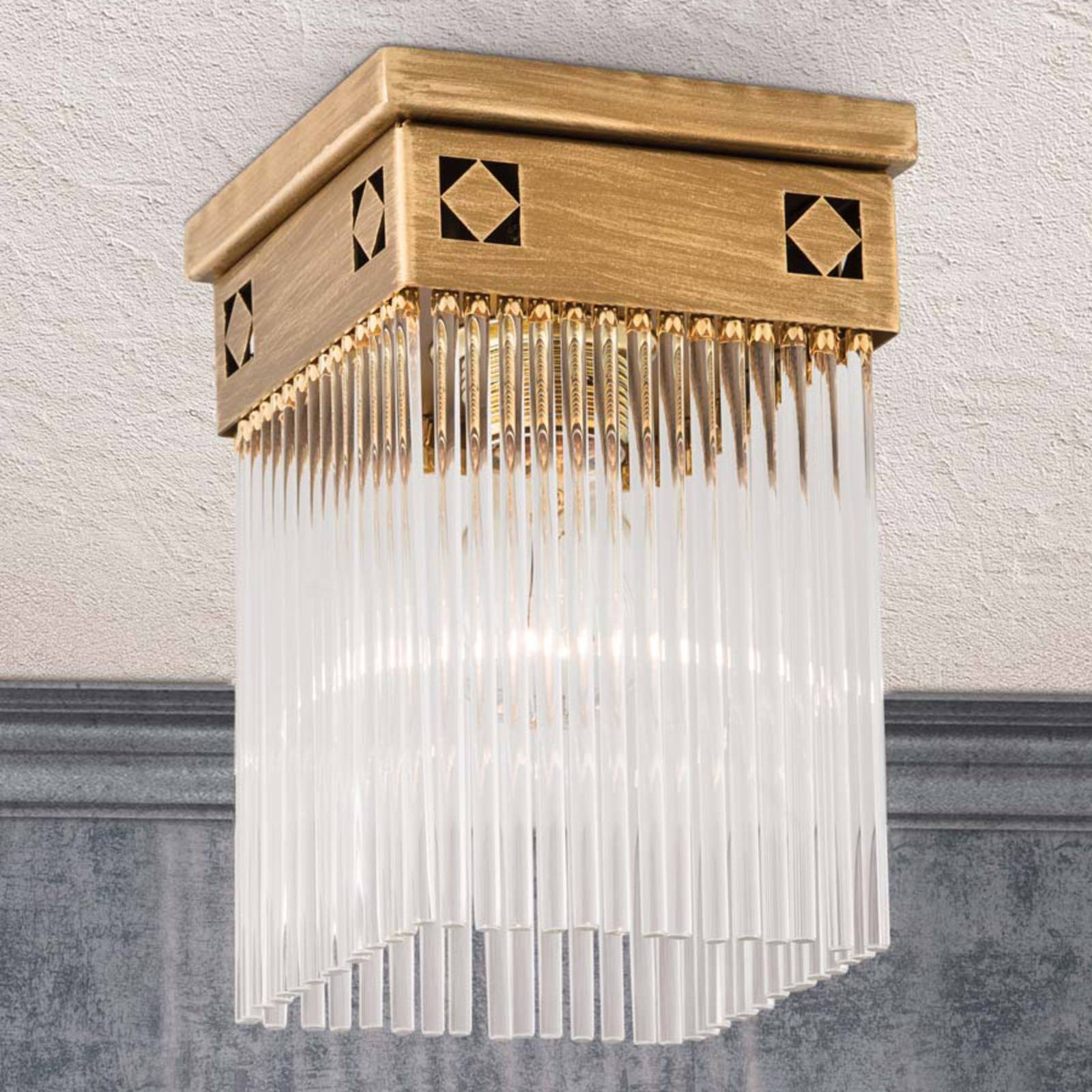 Kvalitné stropné svietidlo Frieda z mosadze a skla Dizajn stropného svietidla Frieda, ktorého hranatá konštrukcia je vyrobená z masívnej mosadze, má ručne nanášanú bronzovú patinu, vďaka čomu vznikajú mierne odtiene. Ornamenty boli zapracované laserovým rezaním. Záves stropného svetla, ktorý plní funkciu tienidla, pozostáva zo sklenených tyčí. Sklo má špeciálny efekt, pretože keď svieti, vytvára sa svetelný kruh na úrovni žiarovky. Stropné svietidlo Frieda bolo vyrobené ručne v Rakúsku a z hľadiska materiálov a výroby je zárukou najlepšej kvality. Masívna mosadz ako základný materiál zaisťuje úplnú ochranu proti hrdzi. Každé svietidlo sa pred opustením výrobného miesta znova skontroluje.