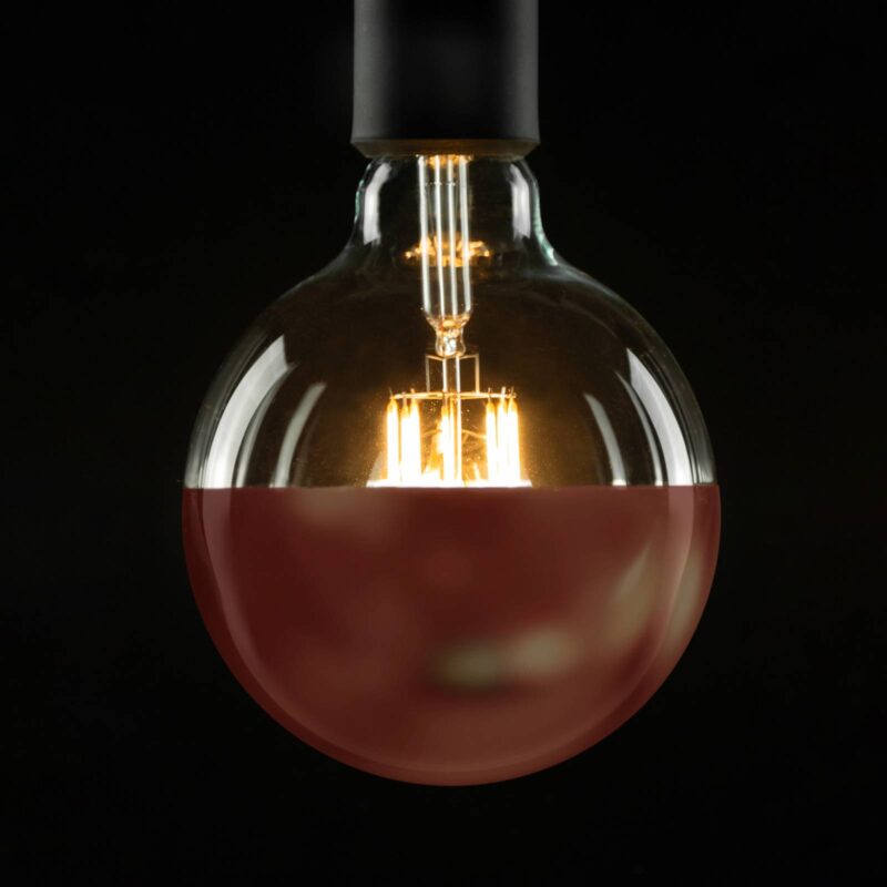 LED guľová žiarovka E27 6,5 W vlákno 2 700 K so zrkadlovou hlavou v medenej farbe Vďaka medenej zrkadlovej hlave vyžaruje táto guľová žiarovka svetlo bez oslnenia, vďaka čomu je obzvlášť vhodná do všetkých beztienidlových objímok alebo na použitie v nástenných svietidlách. Dokonca ani pri priamom pohľade na svietidlo nedochádza k oslneniu. – mimoriadne dobré podanie farieb Ra90 – stmievateľné pomocou mnohých bežných stmievačov (napr. Eltako, Gira, System 200/3000 a iné)