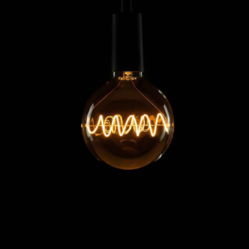 LED mostové guľové svietidlo E27 G125, 7W s čírym sklom zo série Design Line V priehľadnom skle tejto žiarovky s LED diódami boli umiestnené mimoriadne teplé biele LED diódy vo veľmi zvláštnom usporiadaní. Tvoria špirálu, ktorá prebieha vodorovne uprostred pohára. Špeciálny zdroj svetla pre všetky druhy svetiel bez dáždnika, ktorý sa vyznačuje obzvlášť dobrým podaním farieb a je možné ho stlmiť. – skvelá optika vďaka horizontálne umiestneným špirálovým LED diódam – stmievateľné pomocou mnohých stmievačov, ako je ELTAKO, EUD12NPN, GIRA, systém 2000/3000