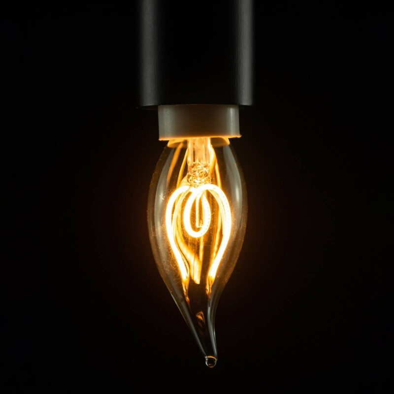 Stmievateľná LED žiarovka E14 v tvare plameňa sviečky vo vetre, 2 200 K Priehľadné sklo aj vlákna tejto LED lampy na sviečky presvedčia svojimi zakrivenými tvarmi. Teplé biele svetlo tejto LED lampy navyše zdôrazňuje jej tvar, ktorý pripomína plameň sviečky zasiahnutý poryvom vetra. Okrem toho sa dá externe stmievať, aby sa dosiahla požadovaná atmosféra tým najlepším možným spôsobom. – Porovnávacia hodnota: 20 Watt – Veľmi teplá farba svetla (2 200 Kelvinov) – vysoký index podania farieb (CRI >90) – Počet spínacích cyklov: 100 000 – externe stmievateľné
