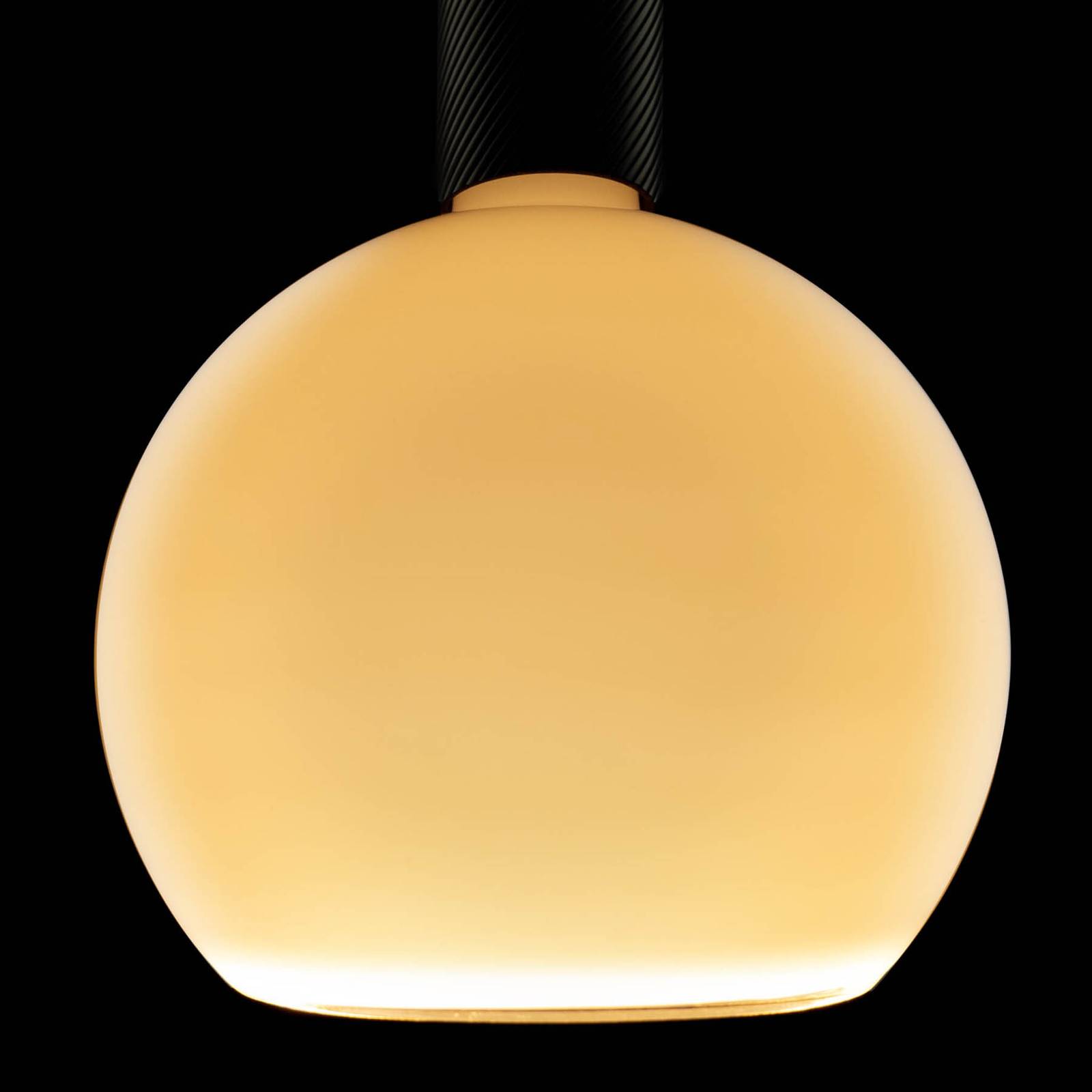 LED žiarovka E27 Floating, Ø 20 cm, 6 W, biela sklenená žiarovka Táto LED žiarovka E27 zo série Floating je vybavená bielou sklenenou žiarovkou v tvare veľkej gule G200, ktorá je otvorená na opačnom konci ako pätica. Diódy sú integrované v otvore v tvare prstenca. Kovová pätica E27 má zlatú povrchovú úpravu a patentovaná technológia mäkkého vlákna a atraktívne odrazy svetla dodávajú svetelnému zdroju ďalšiu dekoratívnu hodnotu. Ideálne pre otvorené svietidlá bez tienidla alebo svietidlá s objímkou – externe stmievateľné (závesný okraj) – mimoriadne teplé biele svetlo – dobré podanie farieb (CRI 90) – ručne vyrobená sklenená žiarovka