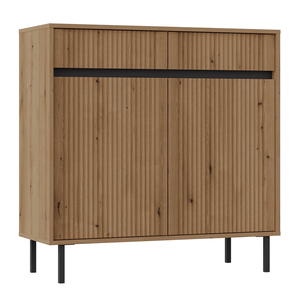 Obývací sektor SELESTA je v minimalistickom prevedení. Je spestrená dizajnom japonskej estetiky. Nábytok má elegantné vysoké nožičky, ktoré sú v čiernej farbe a sú vyrobené z kovu. Dodávajú nábytku ľahkosť. Výraznou dekoráciu nábytku sú drážkované čelá. Jednotlivé prvky SELESTA boli navrhnuté tak, aby každý prvok mohol byť použitý samostatne.Predná časť je vyrobená z kvalitného MDF materiálu v kombinácii s LTD o hrúbke 16 mm. Dosky sú nenáročné na údržbu. Korpus je vyrobený z LTD dosiek, s ABS hranami. Nožičky sú kovové, v čiernom prevedení. Farba: dub EvokeRozmery:šírka: 100 cmvýška: 85 cmhĺbka: 40 cmvýška nožičiek 15 cm.Dodávame v demontovanom stave.