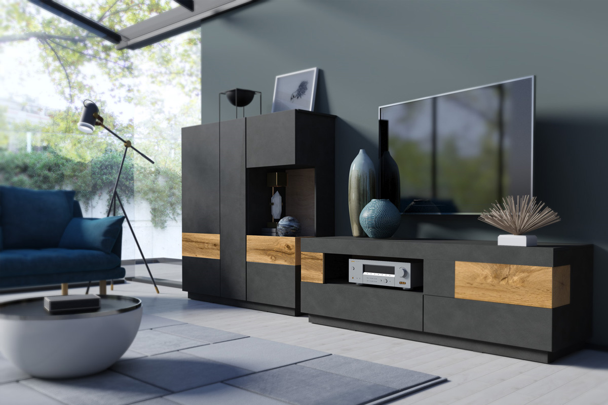 Obývacia zostava SELINKA 16 patrí k nábytku, ktorý je charakteristický svojim kvalitným prevedením a praktickým riešením. Vďaka viacerým farebným kombináciám si z tejto kolekcie vyberie každý .Korpus nábytku je vyrobný z LTD dosky. Dvierka sú z MDF dosky, potiahnutej kvalitnou membránovou fóliou. Tento materiál je nenáročný na údržbu. Hlavnou farbou nábytku je matera. Tá je doplnená štýlovými vkladmi vo farebnom odtieni moreného dubového wotanu. Toto prepojenie dodáva nábytku štýlovosť a jedinečnosť.Zostava SELINKA 16 obsahuje 2 prvky:SELINKA 41 – TV stolík v modernom prevedení. V jednej časti ponúka otvorenú poličku, pod ktorou je priestor s výklopným systémom otvárania dvierok. V druhej časti viete efektne využiť 2 praktické šuplíky. Ponúka variabilný odkladací priestor, do ktorého dokážete umiestniť tak techniku ako aj rôzne dokumenty, či drobné predmety. Rozmery(š/v/h): 160/54/50 cm.SELINKA 46 – široká trojdverová vitrína, Dvoje dvere sú plné, jedny majú presklenú časť. Vo vnútri sa nachádzajú 3 x 2 poličky. Rozmery(š/v/h): 130/139/40 cm.Dvierka sú bezúchytové, využívajú systém push to open. Ku vitríne SELINKA 46 si môžete za príplatok dokúpiť efektné LED osvetlenie. Stena sa predáva ako komplet.Dodávame v demonte.