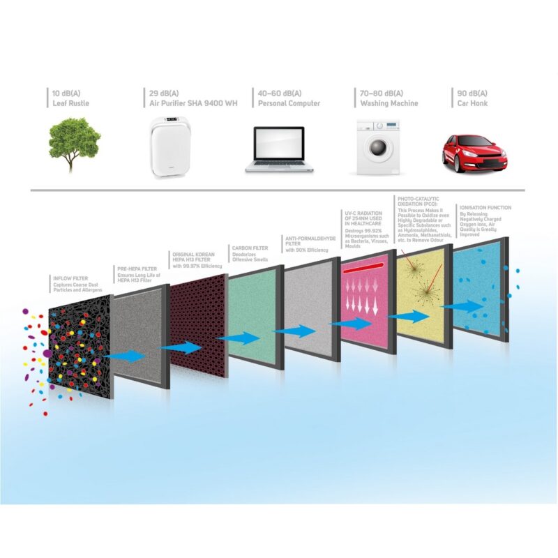 HEPA H13 filter – účinnosť 99,97 %, zachytáva prachové častice, dym, peľ a iné alergénne častice uhlíkový filter – pohlcuje nepríjemné pachy
