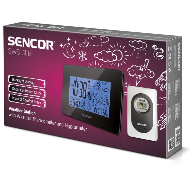 Digitálna meteostanica s bezdrôtovým senzorom merania teploty a vlhkosti zobrazuje vonkajšie a vnútorné teploty a vlhkosti vzduchu. Predpoveď počasia sa zobrazuje pomocou symbolov na veľkom displeji s modrým podsvietením. Hodiny sú riadené rádiovým signálom (automatické nastavenie času a dátumu podľa najpresnejších hodín sveta) a majú 12/24 hodinový režim.Technické parametre: