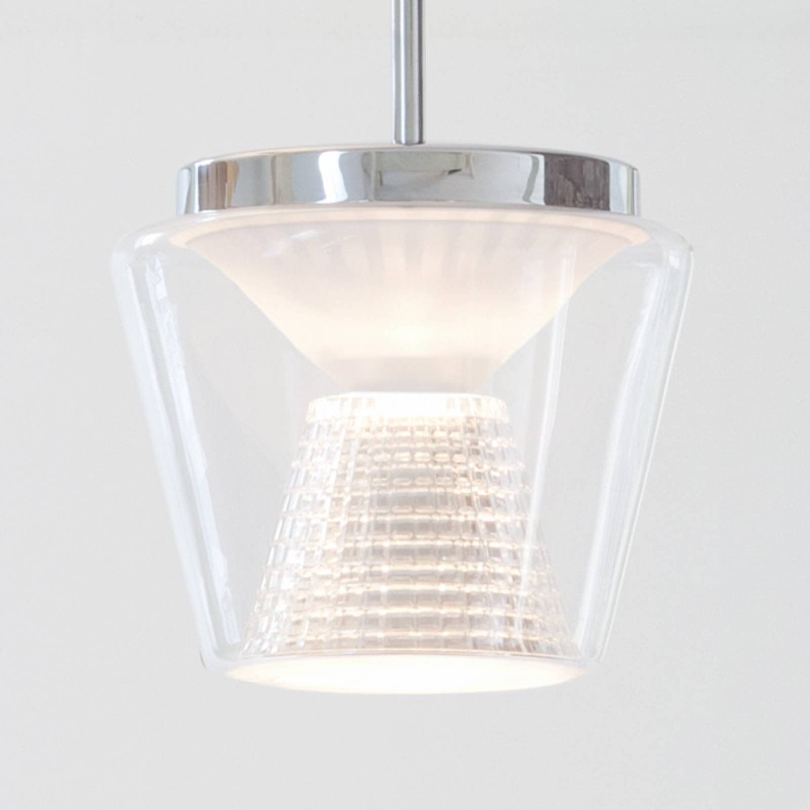 Závesné svietidlo LED Annex L od spoločnosti serien.lighting s čírym skleneným tienidlom a vnútorným reflektorom z lešteného hliníkaZávesné svietidlo Annex, ktoré navrhol profesor Uwe Fischer, vyžaruje svetlo s fascinujúcim efektom, ktoré je vyžarované najmä smerom nadol lešteným vnútorným reflektorom. Vonkajšie tienidlo svietidla má tvar kužeľa a je vyrobené z číreho, ústami fúkaného skla a obklopuje leštený hliníkový reflektor, ktorý odráža tvar vonkajšieho tienidla. Vďaka tejto zvláštnej symbióze svetla a tvaru je závesné svietidlo Annex LED svetelným zdrojom, ktorý je rovnako vhodný do súkromných obytných priestorov ako aj do mnohých komerčných objektov. Moderná technológia LED je umiestnená v kryte z lesklého bieleho lakovaného hliníka. Zaručuje veľmi dobré podanie farieb, energetickú účinnosť a dlhú životnosť; aj keď sa životnosť LED diód po mnohých rokoch skončí, svetelný zdroj sa dá vymeniť vďaka patentovanému systému. Tienidlo závesného svietidla je pripevnené k pochrómovanej oceľovej rúrke pomocou bajonetového zámku (manipulácia bez použitia náradia), ktorý vytvára spojenie so strieškou z lešteného hliníka.- externe stmievateľné (TRIAC)