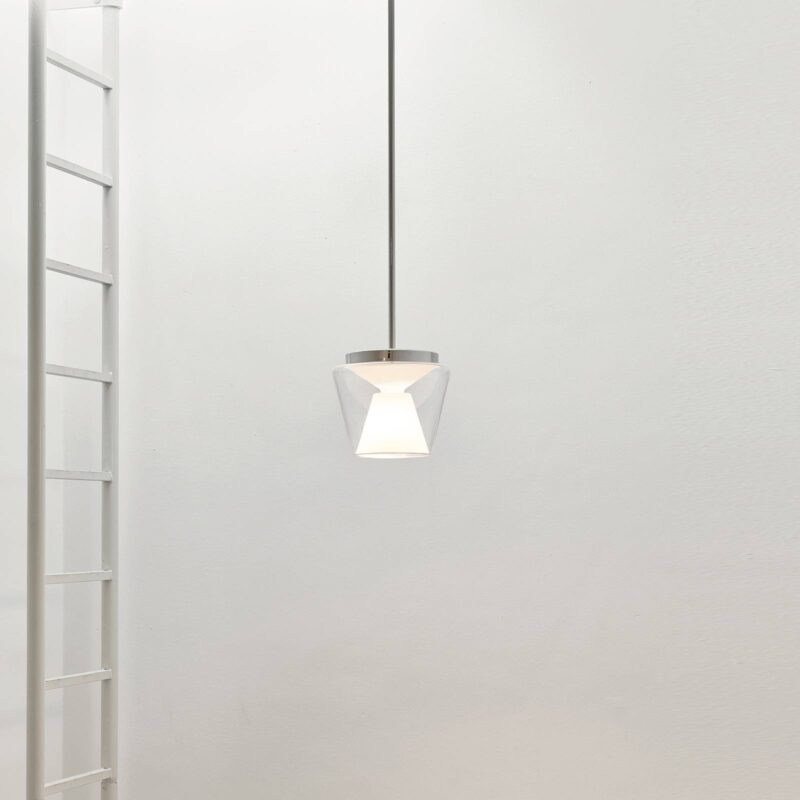 Závesné svietidlo LED Annex M so skleneným tienidlom a vnútorným reflektoromZávesné svietidlo LED Annex je takmer archetypálne závesné svietidlo, ktoré navrhol nemecký priemyselný dizajnér profesor Uwe Fischer. Výrobca serien.lighting kombinuje všestranne kombinovateľný exteriér s pokročilou technológiou.Vďaka reflektoru vo vnútri priehľadného kužeľového tienidla z fúkaného skla sa dosahujú diferencované svetelné efekty. Závesné svietidlo je všestranné a vhodné najmä do vysokých miestností. Môže sa používať rovnako dobre v súkromných obývacích izbách alebo jedálňach ako aj v obchodných alebo gastronomických priestoroch. Priehľadné vonkajšie tienidlo aj vnútorný reflektor závesného svietidla majú tvar kužeľa, pričom vnútorný reflektor kopíruje orientáciu vonkajšieho tienidla.Svetelný zdroj s modernou technológiou LED a veľmi dobrým podaním farieb energeticky úsporne osvetľuje každú miestnosť a vyznačuje sa dlhou životnosťou. Štandardizovaný systém výmeny umožňuje výmenu jednotky LED, ktorá je uložená v lesklom bielom lakovanom hliníkovom kryte. Používateľsky prívetivé nastavenie jasu je možné pomocou externého stmievača (TRIAC). Tienidlo svietidla sa dá ľahko a bez použitia náradia odstrániť a namontovať vďaka bajonetovej úchytke. Chrómovanú oceľovú rúrku, ktorá sa pripája k leštenej hliníkovej strieške, možno počas inštalácie skrátiť.
