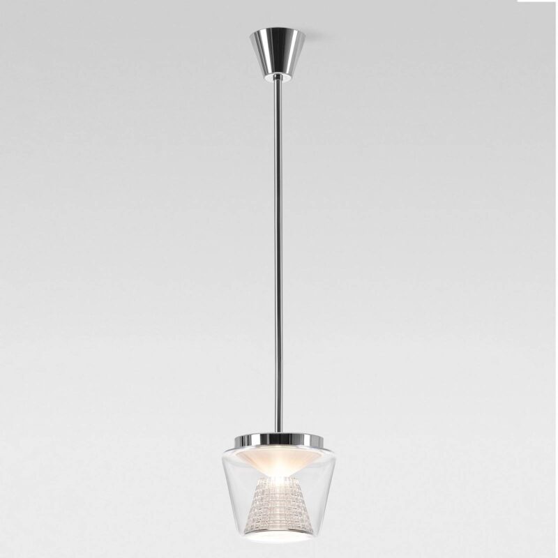 Závesné svietidlo LED Annex M so skleneným tienidlom a vnútorným reflektoromZávesné svietidlo LED Annex je takmer archetypálne závesné svietidlo, ktoré navrhol nemecký priemyselný dizajnér profesor Uwe Fischer. Výrobca serien.lighting kombinuje všestranne kombinovateľný exteriér s pokročilou technológiou.Vďaka reflektoru vo vnútri priehľadného kužeľového tienidla z fúkaného skla sa dosahujú diferencované svetelné efekty. Závesné svietidlo je všestranné a vhodné najmä do vysokých miestností. Môže sa používať rovnako dobre v súkromných obývacích izbách alebo jedálňach ako aj v obchodných alebo gastronomických priestoroch. Priehľadné vonkajšie tienidlo aj vnútorný reflektor závesného svietidla majú tvar kužeľa, pričom vnútorný reflektor kopíruje orientáciu vonkajšieho tienidla.Svetelný zdroj s modernou technológiou LED a veľmi dobrým podaním farieb energeticky úsporne osvetľuje každú miestnosť a vyznačuje sa dlhou životnosťou. Štandardizovaný systém výmeny umožňuje výmenu jednotky LED, ktorá je uložená v lesklom bielom lakovanom hliníkovom kryte. Používateľsky prívetivé nastavenie jasu je možné pomocou externého stmievača (TRIAC). Tienidlo svietidla sa dá ľahko a bez použitia náradia odstrániť a namontovať vďaka bajonetovej úchytke. Chrómovanú oceľovú rúrku, ktorá sa pripája k leštenej hliníkovej strieške, možno počas inštalácie skrátiť.