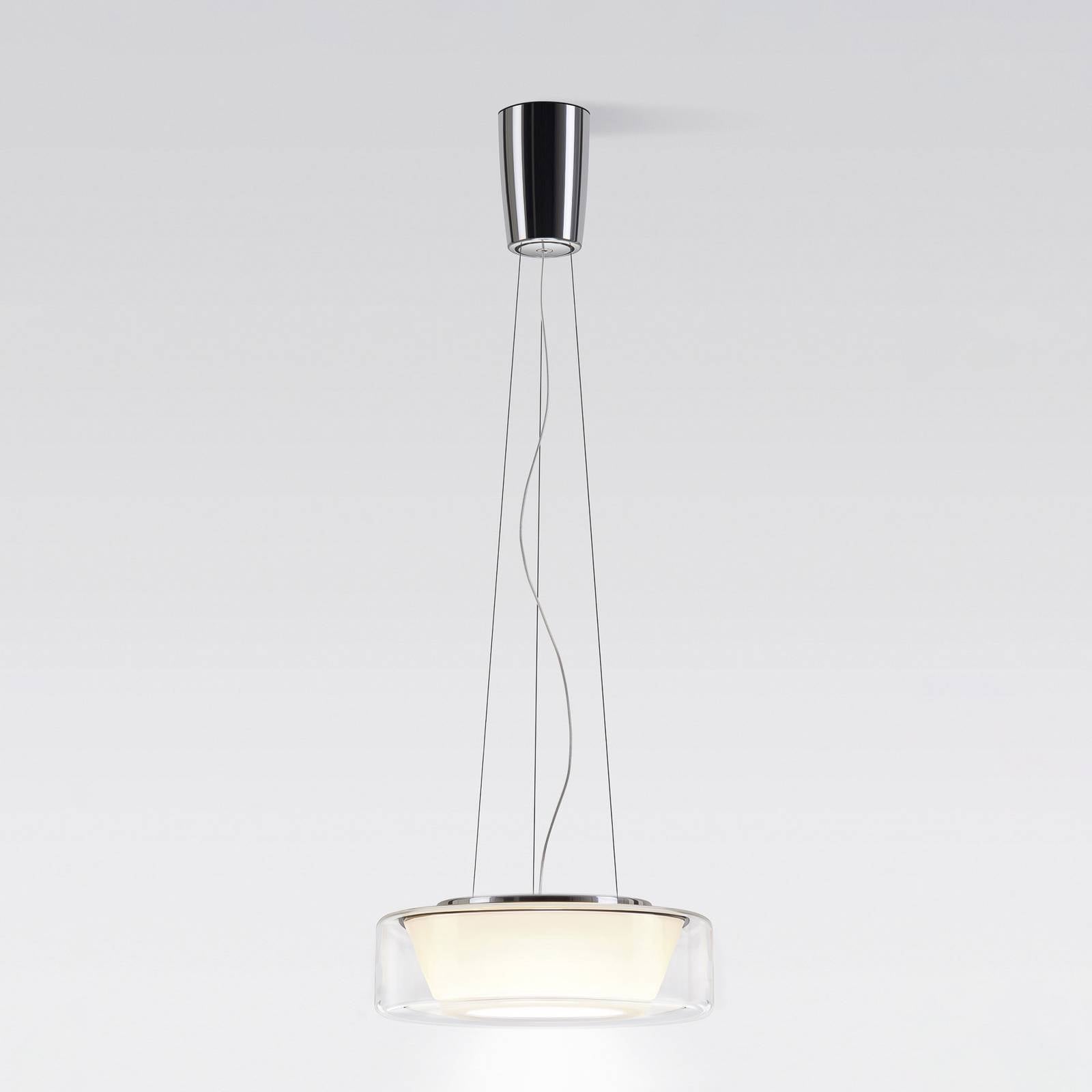 Závesné svietidlo LED Curling L s tienidlom z fúkaného skla a zavesením na lanoZávesné svietidlo LED Curling L je šikovnou kombináciou udržateľnej, sofistikovanej technológie LED a nadčasovo elegantného tvaru. Svietidlo s tienidlom z fúkaného číreho skla v tvare plochého valca a ručne nastaviteľným zavesením zo štíhlych oceľových laniek sa hodí do každého interiéru a je ideálne nielen do súkromných priestorov, ale aj na použitie v zmluvnom alebo pohostinskom sektore. Strieška a kryt svietidla sú vyrobené z hliníka s lesklým povrchom a dodávajú svietidlu Curling L moderný charakter. Optická vložka je pripevnená na dvoch magnetických bodoch pod svetelným zdrojom. Jej špeciálny rez zabezpečuje optimálne rozloženie priameho svetla a okolitého svetla vyžarovaného dookola. Svetelný zdroj LED možno vymeniť v prípade poruchy alebo po skončení životnosti vďaka patentovanému systému výmeny a tienidlo možno bez použitia náradia nastaviť na záves oceľového lanka. Bajonetový zámok umožňuje odobrať tienidlo, ktoré možno umývať v umývačke riadu, aj bez použitia náradia. Sériu svietidiel Curling navrhli Jean-Marc da Costa a Manfred Wolf, ktorí v roku 1985 založili spoločnosť serien.lighting. Spoločnosť predstavuje inteligentné riešenia osvetlenia s redukovaným moderným dizajnom a sofistikovanými konštrukciami na optimalizáciu svetelného efektu.- externe stmievateľné (TRIAC)