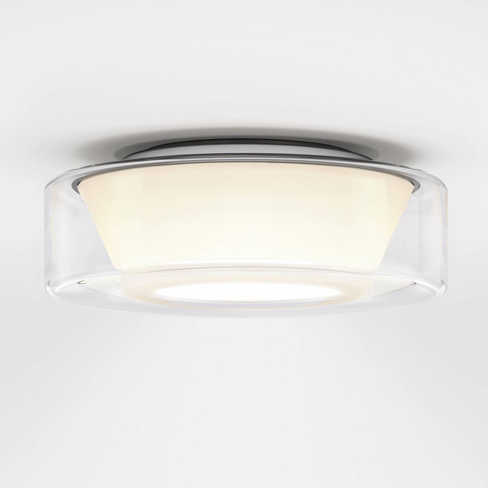 Via Triac Stmievateľné stropné svietidlo LED Curling s čírym skleneným tienidlom a kónickým difúzorom, 2 700 K Stropné svietidlo LED Curling je inšpirované populárnym a olympijským zimným športom a jeho vzorom je rovnomenný curlingový kameň. V tejto verzii pozostáva tienidlo z číreho skla fúkaného v Nemecku, ktoré pri pohľade zdola zakrýva hliníkový vrchlík, a tak sa zdá, že sa vznáša na strope. Okrem toho je vo vnútri skla umiestnený reflektor smerujúci nadol vyrobený z opálovo bieleho polykarbonátu, ktorý je v strede otvorený a doplnený špeciálne brúseným difúzorom pod zdrojom svetla. tým sa zabezpečí optimálne rozložené a príjemné vyžarovanie svetla smerom nadol. Teplé biele svetlo, ktorého jas je externe stmievateľný pomocou triaku, generujú integrované LED diódy, ktoré navyše svietia s dobrým podaním farieb. Ocenený dizajn kolekcie Curling vytvorili dizajnéri Jean-Marc da Costa a Manfred Wolf. Sú tiež zakladateľmi a konateľmi výrobcu serien.lighting.