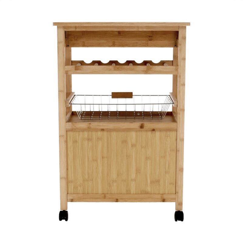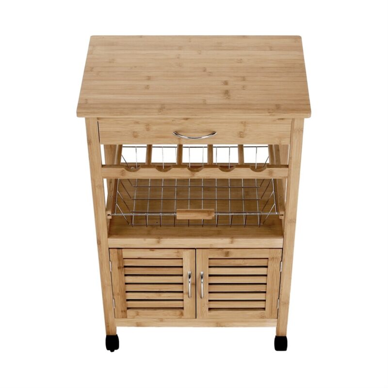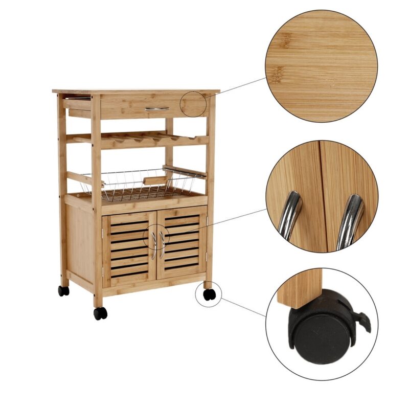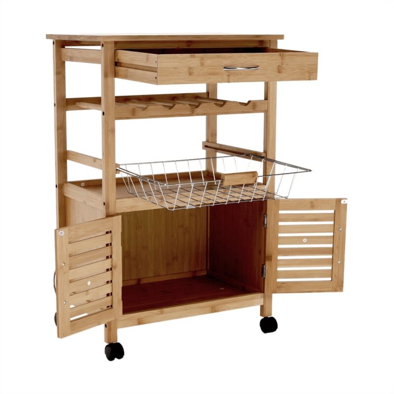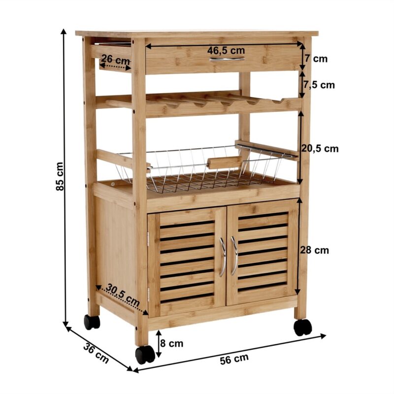 Prichádza pomocník, ktorý je vždy tam, kde je potrebný dodatočný úložný priestor. Servírovací vozík NAVID sa prezentuje ako multifunkčný pomocník. Hrdo sa pýši jedinečným dizajnom a množstvom odkladacieho priestoru.Disponuje jednou zásuvkou na príbory alebo iné kuchynské náčinie. Výsuvný košík vyrobený z kovu je perfektné riešenie na uskladnenie ovocia a zeleniny. Nad košíkom sa nachádza latová polica s držiakom na fľaše. V spodnej časti sa nachádza dvojdverová skrinka, v ktorej je možné dobre uskladniť riad alebo zásoby potravín a v prípade potreby sú k dispozícii.Vozík je vyrobený z bambusu v jedinečnom prírodnom prevedení, hravo a ľahko zapadne do akéhokoľvek interiéru. O rýchly presun sa starajú štyri kolieska, z čoho dve disponujú brzdami, ktoré ho neochvejne držia na zvolenom mieste. Privezie, odvezie a uskladní všetko, čo budete potrebovať.