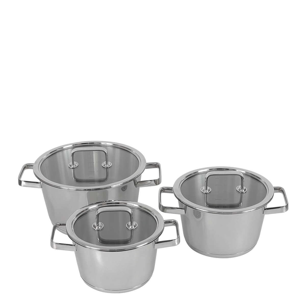 Šesťdielna súprava hrncov so sklenenou pokrievkou a nadčasovým dizajnom. Štýlový vzhľad hrncov urobí z varenia zážitok. Kvalitný materiál zaručuje dlhú životnosť. Set obsahuje: 1× hrniec ø18 cm + 1× sklenená pokrievka 1× hrniec ø20 cm + 1× sklenená pokrievka 1× hrniec ø24 cm + 1× sklenená pokrievka