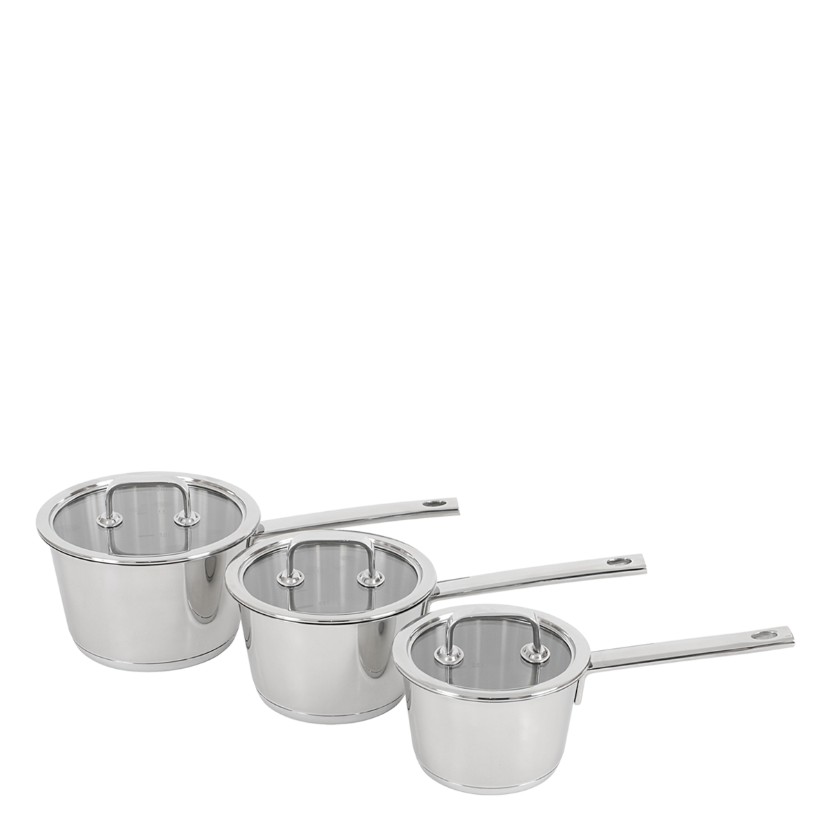 Praktický set rajníc z nehrdzavejúcej ocele so sklenenými pokrievkami. Kónicky tvar a sendvičové dno zaistia bezstarostné potešenie z varenia. Zaujmú aj nadčasový dizajn a štýlový vzhľad. Kvalitný materiál je zárukou dlhej životnosti. Jednoduché čistenie šetrí čas a vodu, čo je ďalšie plus týchto funkčných rajníc. Vhodné na všetky typy sporákov vrátane indukcie. Kolekcia Merkur patrí do línie Master Chef. Set obsahuje: 1× rajnica ø14 cm + 1× sklenená pokrievka 1× rajnica ø16 cm + 1× sklenená pokrievka 1× rajnica ø18 cm + 1× sklenená pokrievka