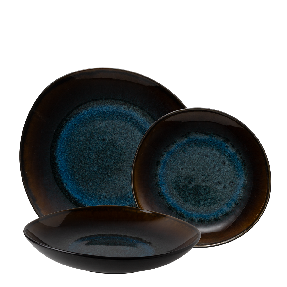 Set tanierov z kolekcie Elements Amber Eye Organic očarí výraznou kombináciou hlbokej modrej a teplých jantárových tónov, ktoré vytvára reaktívna glazúra. Nepravidelný tvar pôsobí nadčasovo a dodáva setu prirodzenú eleganciu. Tento sofistikovaný set tanierov premení každé stolovanie na estetický zážitok.