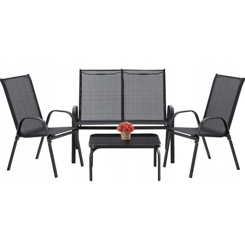 Táto zostava záhradného nábytku je ako stvorená pre ľudí, ktorí hľadajú spojenie klasiky a elegancie. Jednoduchý tvar a štýlový dizajn poteší každého. Hodí sa kamkoľvek – na balkón, terasu alebo do záhrady. Stolík má tvrdené sklo s priehľadnou mozaikovou textúrou (pre svojpomocnú montáž). Nábytok je vyrobený z hustého opletu natiahnutého cez rám. Špecifikácie:Farba: čiernaRozmery: uvedené na obrázku Sada obsahuje: stôl, sedačku a dve stoličky