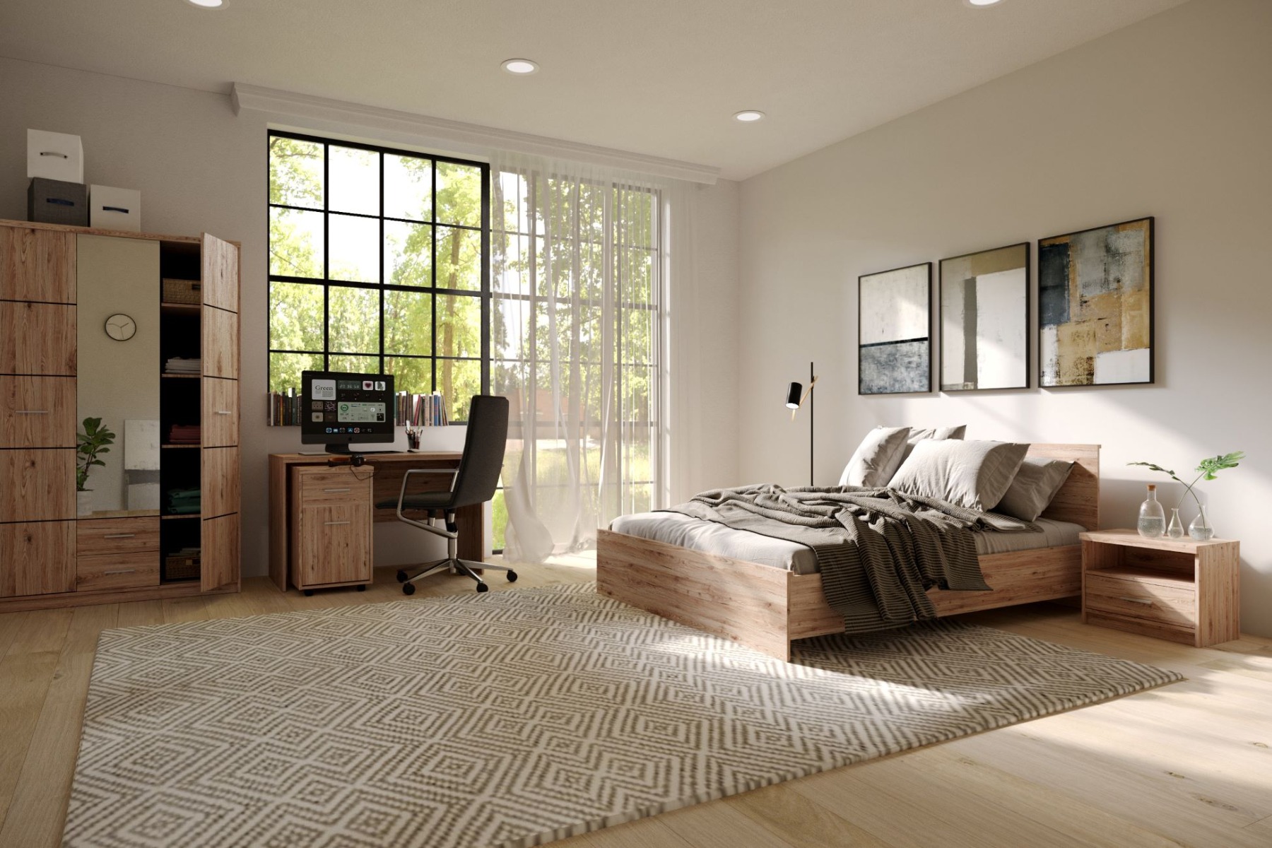 Spálňová zostava SHANIA je vyrobená z kvalitného LTD materiálu vo farbe dub san remo svetlý s výraznou kresbou dreva. Kolekcia je navrhnutá v minimalistickom štýle a s radosťou si vychutnáte zvláštne čaro a pohodlie takto vytvoreného nábytku. Nábytok SHANIA harmonicky zapadne do každého interiéru a vďaka svojmu dizajnu pôsobí v interiéri vzdušne a ľahko.Prvky spálňovej zostavy SHANIA vnesú do vášho domova ľahkosť a eleganciu a kontrastná farba a predĺžené rukoväte mu dodávajú dynamiku. Zostava obsahuje:šatníkovú skriňu 3D2S – (š/v/h) 119/199/54 cmmanželskú posteľ + rošt – (š/v/h) 164/85/205 cm; výška sedenia 37 cm2 x nočný stolík s 1 zásuvkou – (š/v/h) 53/44/35 cmSpálňová zostava SHANIA bude skvelým doplnkom interiéru vašej spálne a poteší vás svojou kvalitou a spoľahlivosťou.Dodávame v demonte.