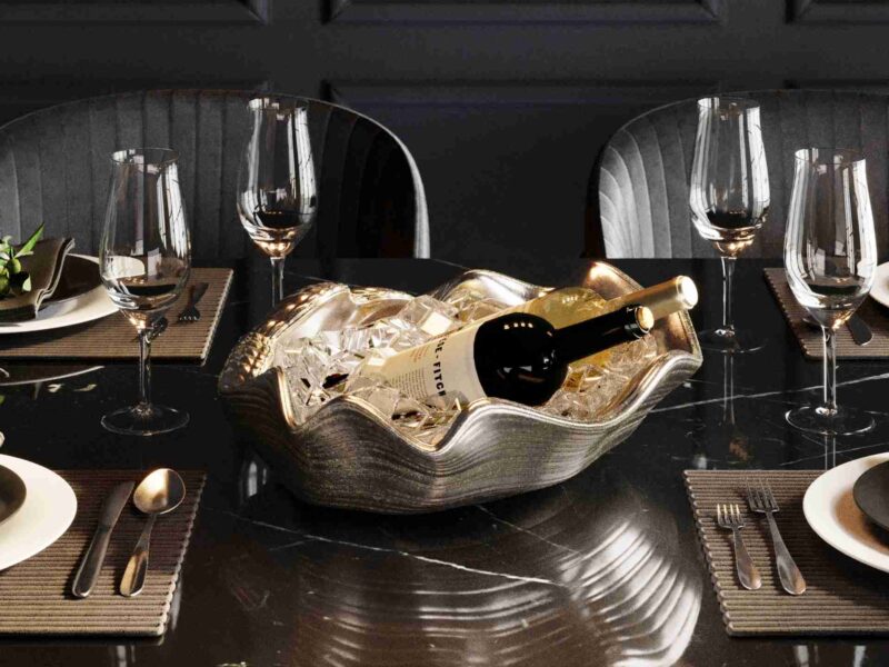 Originálna nádoba na chladenie vína v lesklom striebornom prevedení.