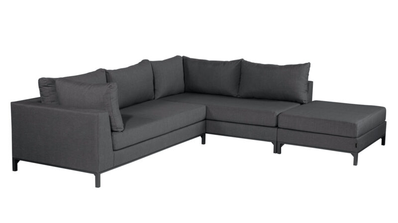 Priestranná vonkajšia rohová pohovka v štýlovom dizajne vám poskytne množstvo miesta na sedenie.