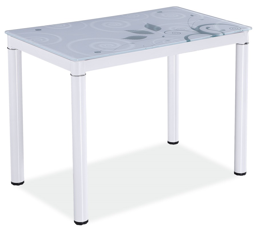 Jedálenský stôl DAMAR je vyrobený z kovu a tvrdeného skla bielej farby, pričom na výber je aj v iných farebných vyhotoveniach. Doska stola je doplnená jemnými a veľmi elegantnými modernými kresbami. Za stôl možno pohodlne usadiť 4 osoby.