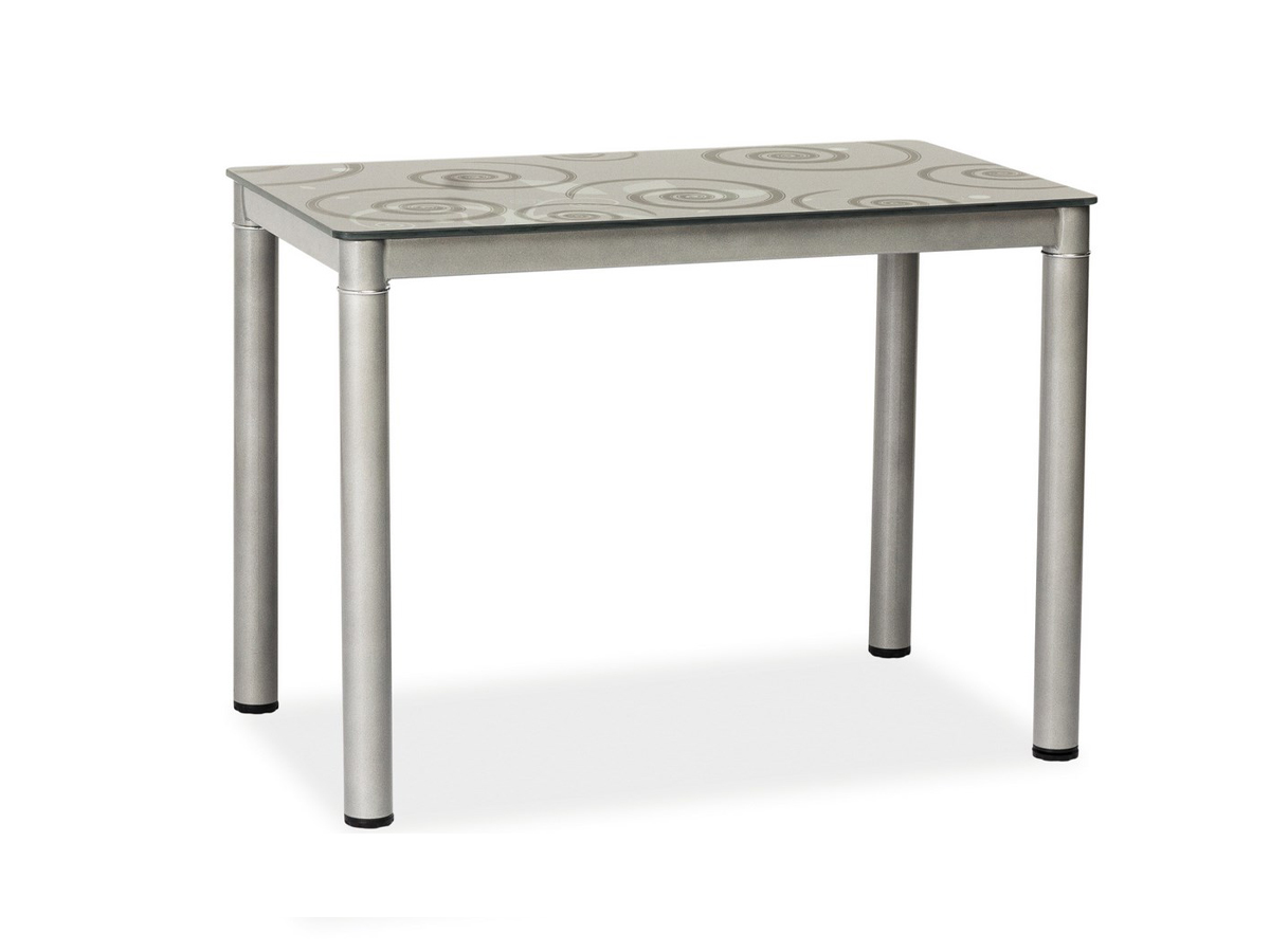 Jedálenský stôl DAMAR je vyrobený z kovu a tvrdeného skla sivej farby, pričom na výber je aj v iných farebných vyhotoveniach. Doska stola je doplnená jemnými a veľmi elegantnými modernými kresbami. Za stôl možno pohodlne usadiť 4 osoby.