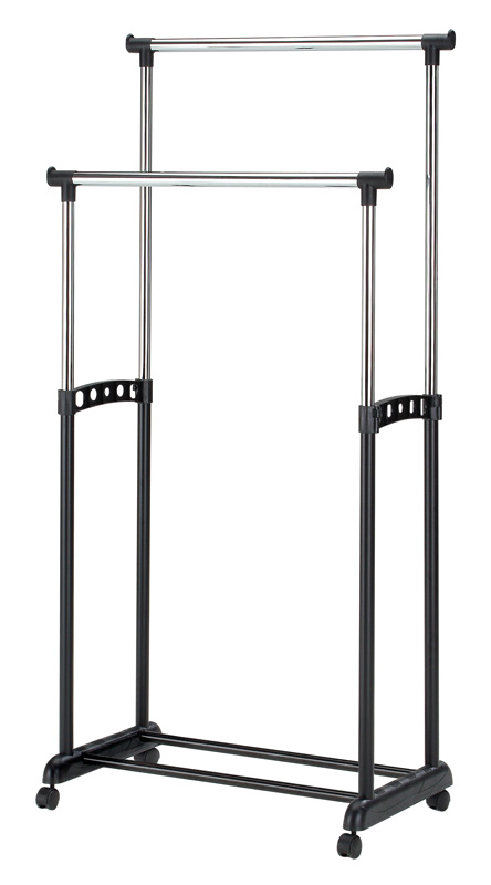 Kovový vešiak NOVA II sa skladá z ľahkého kovového rámu v kombinácií chróm / čierna farba. Vešiak obsahuje dvojitú konštrukciu a vďaka kolieskam je možné s ním ľahko manipulovať.