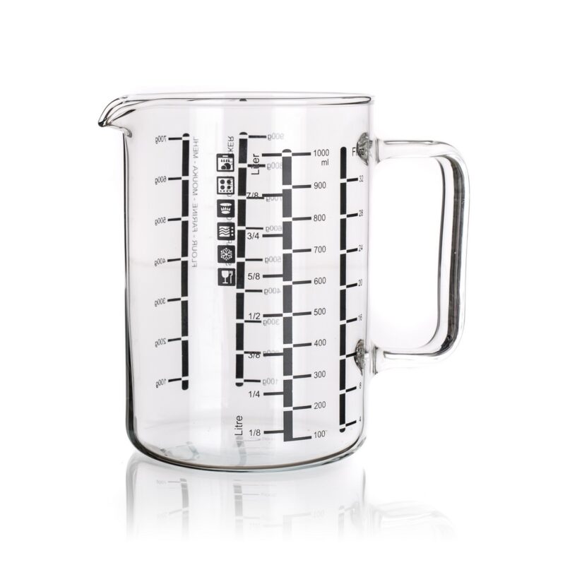 Kuchynská odmerka s objemom 1 l, vyrobená z tvrdého boritokřemičitého skla, bude praktickým pomocníkom v každej kuchyni. Sklo je veľmi odolné (mechanicky i teplotne), teplotná odolnosť je + 300 / -40 °C. Výhodou je dlhá životnosť, hygienická nezávadnosť výrobku (je hladký a neporézny), ľahká údržba a ekologickosť.