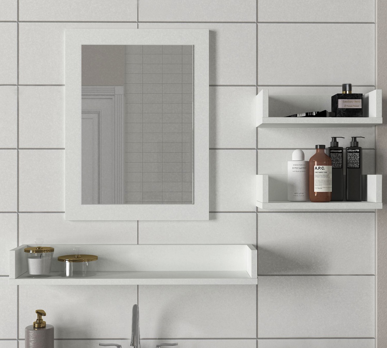 Set zrkadla a troch závesných políc SIMEON bude praktickým pomocníkom do každej kúpeľne. Produkty sú vyrobené z kvalitného 18 mm LTD materiálu, ktoré sú nenáročné na údržbu č ocení každý majiteľ.Farebné prevedenie: biela matnáRozmery: šírka najširšej police 72 cm, výška zrkadla 60 cm (ďalšie rozmery v nákrese)Dodávame v demonte.