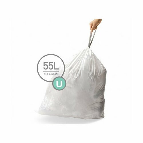 Extra silné sťahovacie vrecia do odpadkového koša – veľkosť U. Objem 55 l, dvojité švy, pevná sťahovacia šnúra. V balení 20 ks. Vhodné pre koše značky Simplehuman. Extra odolný plast a hrubé dvojité švy sa postarajú o to, aby nedochádzalo k nechcenému prasknutiu alebo pretrhnutiu vreca. Navyše vďaka pohodlnej sťahovacej šnúre jednoducho zatiahnete za dve strany šnúry a celé vrece zdvihnete. Potom ho môžete pohodlne odniesť do popolnice.