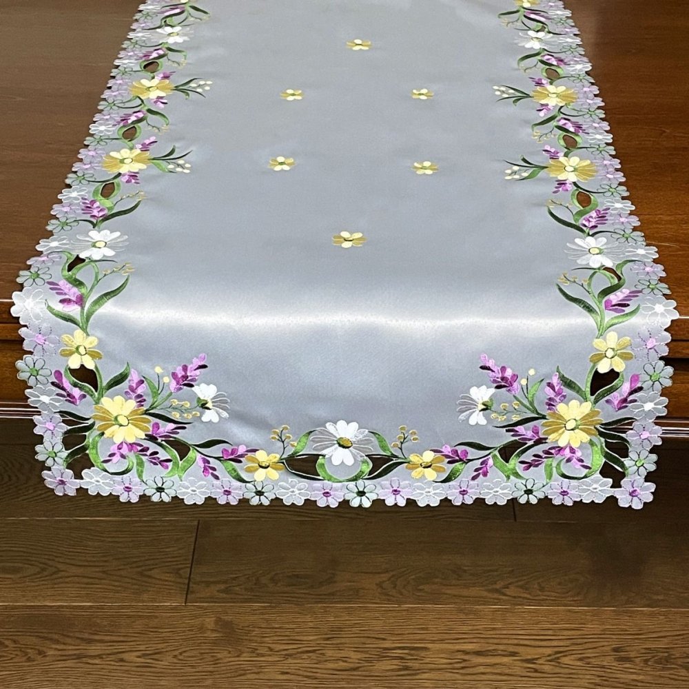Sivý obrus s jemnou výšivkou jarných kvetov Šírka: 40 cm | Dĺžka: 160 cm
