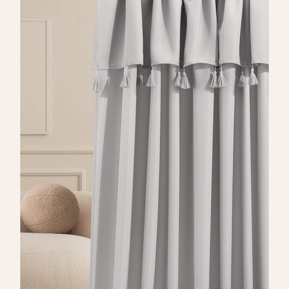 Sivý záves Astoria so strapcami na strieborné priechodky 140 x 280 cm