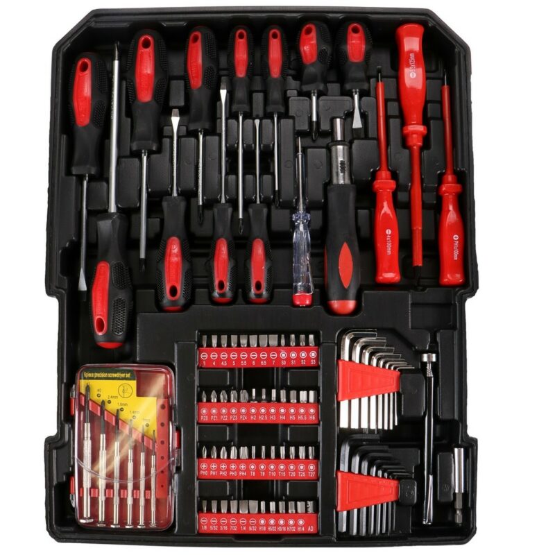 V tejto praktickej sade náradia nájdete všetko, čo môže potrebovať pre svoju prácu každý domáci majster. Náradie je usporiadané v robustnom hliníkovom kufri v prehľadných poschodiach podľa typu použitia a aj napriek vysokému počtu kusov sa s kufrom vďaka šikovným kolieskam a teleskopickému držadlu ľahko manipuluje.