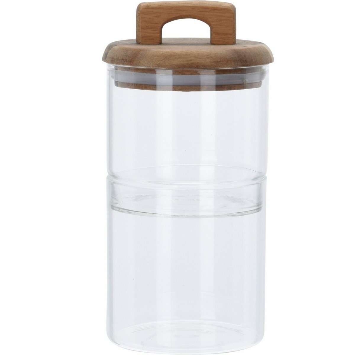 Praktická dvojdielna sklenená dóza s viečkom s rukoväťou na uchovávanie suchých a sypkých potravín. Nájde si miesto aj vo vašej kuchyni, komore alebo na kuchynskej linke.Sklenená dóza sa skladá z dvoch častí a je doplnená tesniacim viečkom. Jedna z nádob je profilovaná tak, aby po vložení do druhej nádoby správne priľnula.Materiál dózy: borosilikátové skloMateriál viečka: drevo akácieMateriál tesnenia: silikónRozmery: