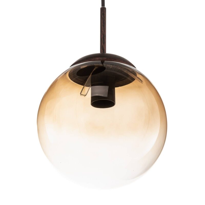 Aranžmán vytvorené z jantárových sklenených gulí – sklenené závesné svietidlo Varus Závesné svietidlo Varus s viacerými zdrojmi svetla je usporiadaním jantárových sklenených gulí na okrúhlom stropnom držiaku hnedej farby. Gule majú rozdielnu veľkosť a sú umiestnené do špirály v rôznej výške, takže vytvárajú skvelý trojrozmerný vzhľad. Sklenené gule sú priehľadné a umožňujú pohľad na vloženú žiarovku. Zmes materiálov a prírodné odtiene hnedej farby prepožičiavajú svietidlu teplý vzhľad, ktorý vytvára najmä po zapnutí svetla príjemnú atmosféru.