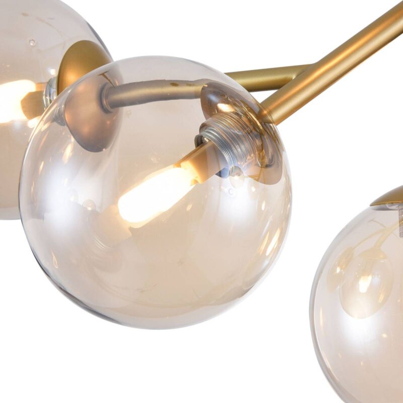 Stropné svietidlo Dallas s dvanástimi lampami – sklá tónované do zlataDvanásť sklenených tienidiel stropného svietidla Dallas sa rozprestiera všetkými smermi – nahor, nadol aj do strán. Sú pripevnené k trom ramenám vychádzajúcim z baldachýnu, ktoré sú – rovnako ako stropný držiak – natreté zlatou farbou, aby ladili so sklami, ktoré sú tónované do rovnakého odtieňa. tónovanie skiel zaručuje fascinujúci svetelný efekt a vytvára očarujúcu atmosféru s útulnosťou, vďaka ktorej sa každý cíti ako doma. Sklenené gule sa pri zapnutí svetla aj navzájom odrážajú, čo ešte viac umocňuje efektný účinok Dallasu.