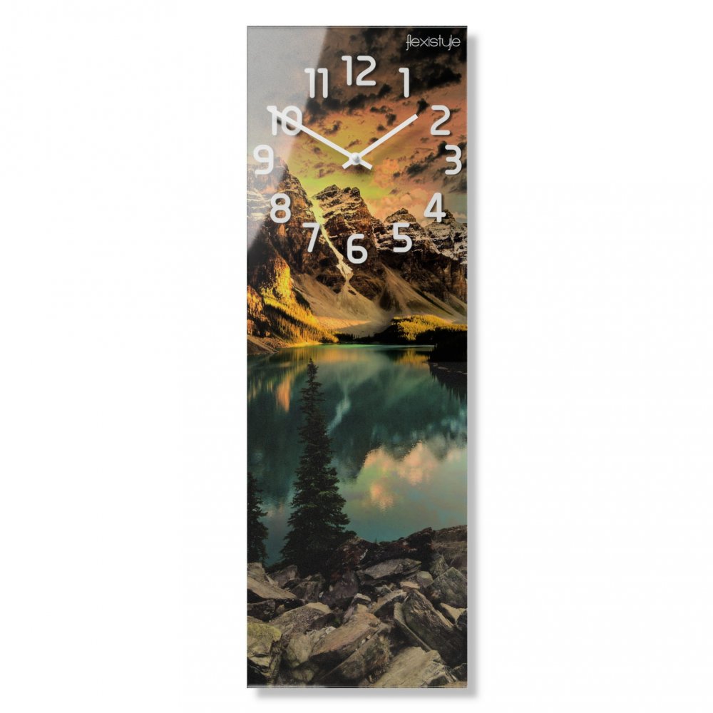Pohľad na vrcholky hôr obklopené lúčmi zapadajúceho slnka. Stromy rastúce na balvanoch sú očarujúcim pohľadom. Špeciálnu pozornosť venujeme jazeru, v ktorom sa ako zrkadlo odráža pohorie. Pri pohľade naň dostaneme chuť navštíviť také divoké a prirodzené miesto. Tieto hodiny majú tlmené farby. Hodia sa do tmavších obývačiek či spální.