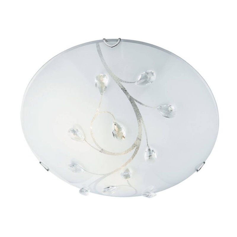 S malými krištáľovými dekoráciami – stropné svietidlo Flush Flower Stropné svietidlo Flush Flower sa skladá z matného matného skla v bielej farbe, ktoré má na vrchnej časti ozdobný kvetinový vzor. To je ideálne doplnené malými krištáľovými listovými dekoráciami, ktoré dávajú inak jednoduchému sklenenému stropnému svetlu Flush Flower niečo isté. Či už cez deň alebo večer pri zapnutom svetle, má svietidlo vždy vizuálny efekt a je obzvlášť pôsobivé na obyčajných, bielych stropoch. Môže byť použitý rôznymi spôsobmi a šikovne skrášli najrôznejšie obytné priestory, či už obývacia izba, chodba alebo spálňa