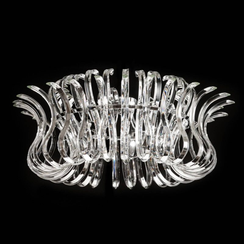 Sklenené stropné svietidlo Wave s extravagantným vzhľadomStropné svietidlo Wave s priemerom 65 cm prináša očarujúce svetlo do veľkých miestností a štýlovo zapadá do moderných interiérov. Jemne zakrivené sklenené prvky spolu vytvárajú umelecké dielo. Halogénové žiarovky umiestnené v tienidle poskytujú nádherný pocit bývania. Žiarovky si môžete zakúpiť v obchode.