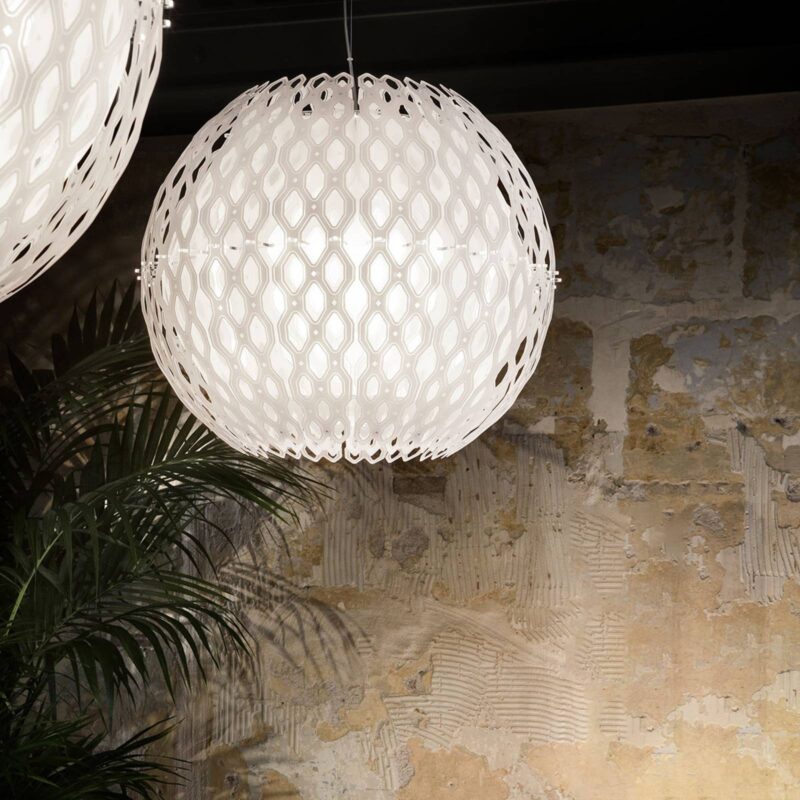 Závesná lampa Charlotte Globe – osvetlená guľa s plástovým vzorom Mimoriadny dizajn dvoch bielych, do seba osadených gúľ určuje vzhľad závesnej lampy Charlotte Globe. Vonkajšie tienidlo na lampu je vyrobené z materiálu Cristalflex® a vnútorná, rozptyľujúca konštrukcia z materiálu Lentiflex® . Použitý magnetický držiak je typický pre výrobcu. Dizajnérska dvojica Doriana a Massimiliano Fuksasovci prepožičali svietiacej guli s plástovým vzorom zo sústredených šesťuholníkov jemnú bohatosť, ktorá vyplní priestor. Závesná lampa je úplne biela a dokonale harmonizuje s mnohými štýlmi zariadení. Dizajnérska dvojica vedie Studio Fuksas, ktoré na celom svete vytvorilo množstvo diel s rôznymi projektmi v oblasti architektúry, interiérového zariadenia až po dizajnérske kolekcie a získalo medzinárodné uznanie. Sériu svietidiel Charlotte vytvorilo Studio Fuksas pre výrobcu Slamp, ktorý od roku 1992 presviedča svojimi ručne vyrobenými svietidlami, ktoré sú výnimočné, ale dostupné. Made in Italy.