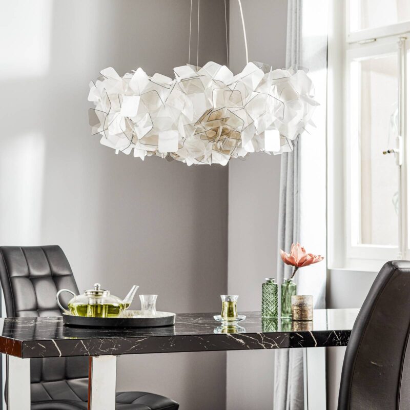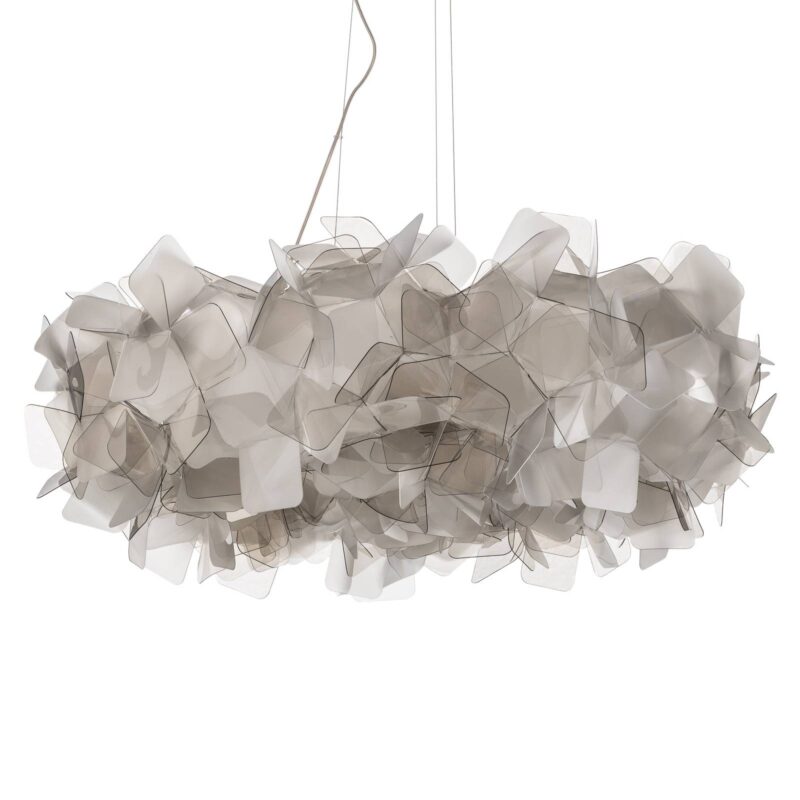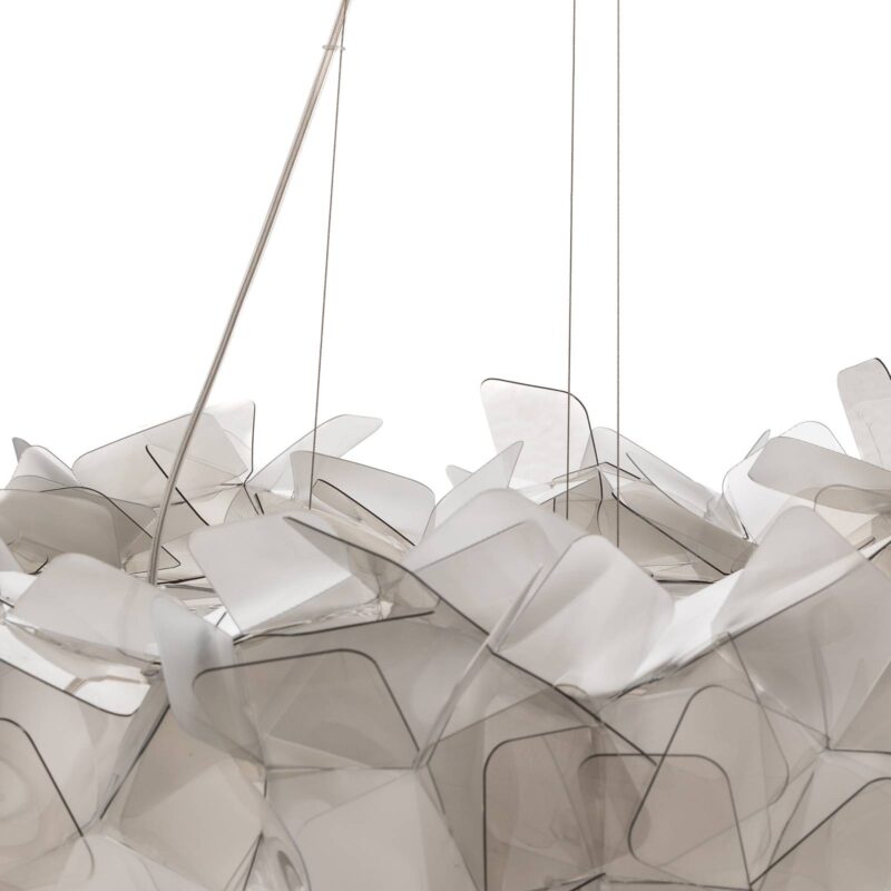 Dizajnová prívesná lampa Clizia – umelecké dielo z priehľadných listov Závesné svietidlo Clizia sa skladá z okrúhleho tienidlo na lampu zloženého z nespočetného množstva nepravidelne usporiadaných listov z priehľadného plastu. V kombinácii so žiarovkami, ktoré majú byť umiestnené vo vnútri, zaisťujú atmosférické účinky svetla a tieňa. Ide o hľadanú súčasť konceptu Adriana Racheleho, ktorý chce s Cliziou realizovať prirodzenú hru tieneného a lámaného slnečného žiarenia. Závesná lampa pripomína korunu stromu alebo oblak osvetlený slnkom. Okrem precízneho remeselného spracovania s bezchybným vzhľadom a nezávislého kreatívneho konceptu Slamp taliansky výrobca Slamp mimoriadny význam použitiu materiálov a techník, ktoré vyvinuli sami. Spoločnosť Clizia Slamp proprietárne plasty a vlastnú konzolu MagneticSystem® od spoločnosti Slamp.